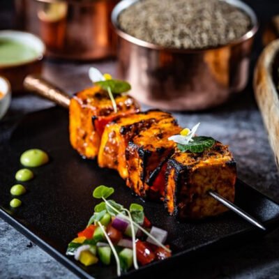 Paneer marinated in angara spices, bell pepper & onions, mustard...